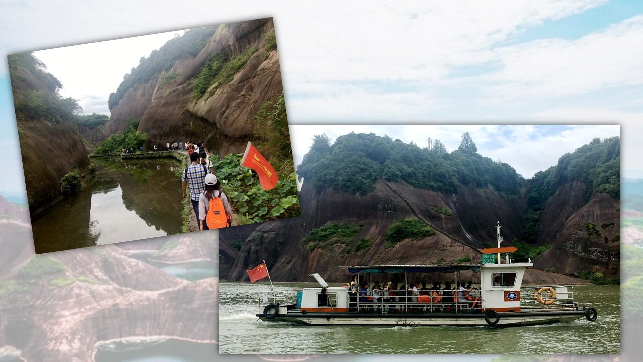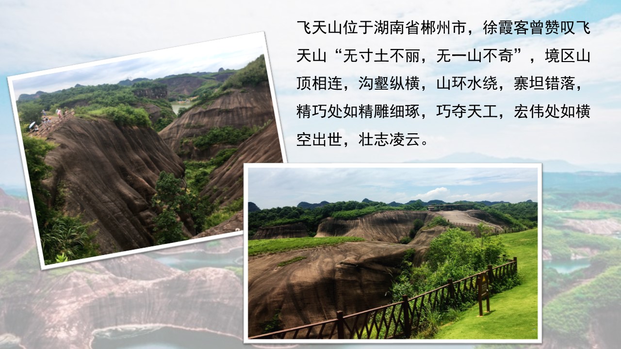 第一站到达飞天山,主峰入口处, 山倒影朦胧安静; 如果国画大师来到这里, 定会万般喜爱!或许会感慨 :水墨山水在此间,飞天山是丹霞地貌, 于郴州境内是难得的景观。去过丹霞山的人, 会觉得下面的模样特别熟悉;岩石的纹路清晰可见, 茂盛的植物只能生长在山头,无论是石还是树都展现着生命力,你定不能想象的是有一位老人就在这里独居,转至山后面, 有荷塘与两山中间,弯曲的小路延伸到很远,这里是产藕之地,配着这水下清晰明净的倒影,便能感受到这山水田园的惬意 !天气虽然有点炎热,但是大家都被这天然的风景所吸引,久久留恋不肯挪步向前,总也看不够,欣赏不完。孩子们也在这天然的风景的嬉笑追逐,好一番美景,美不胜收。