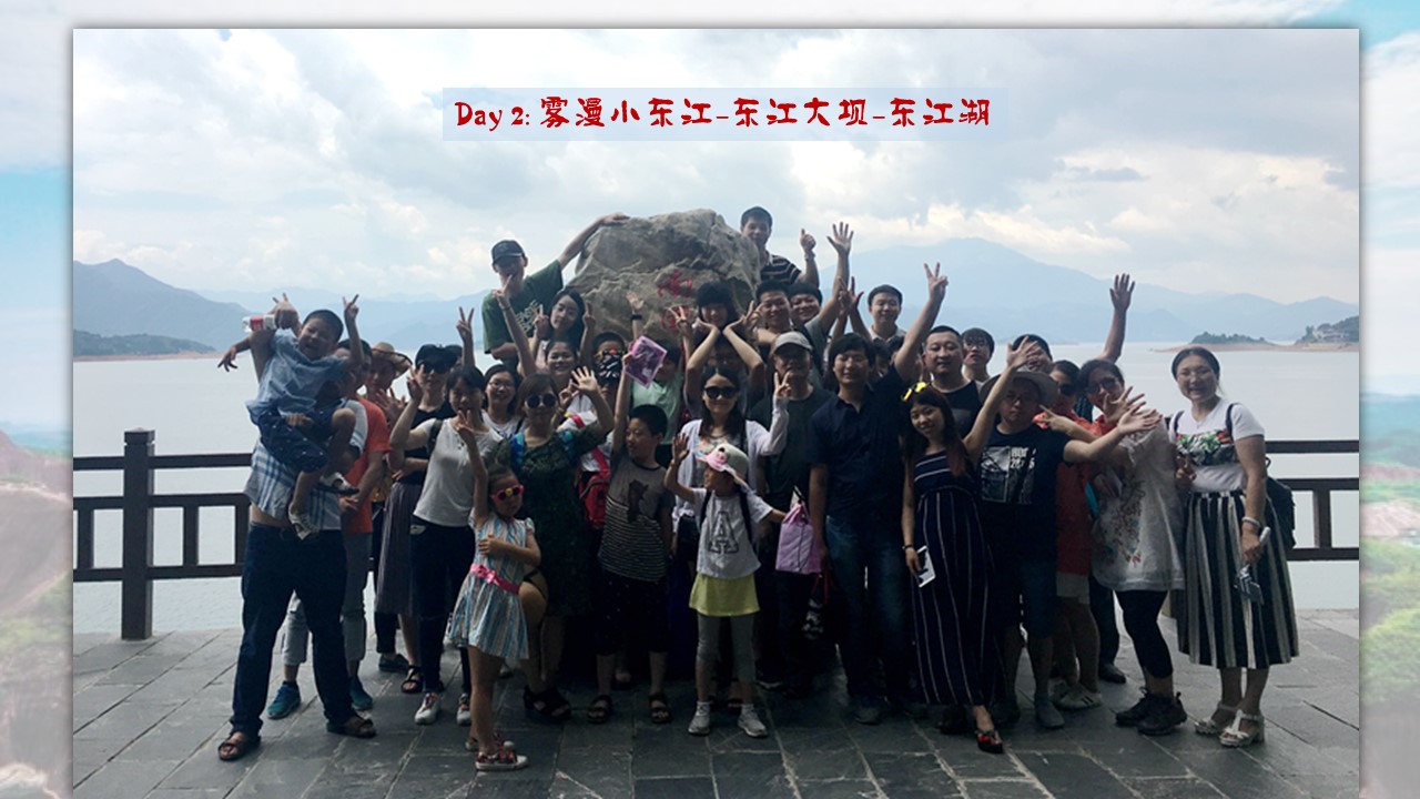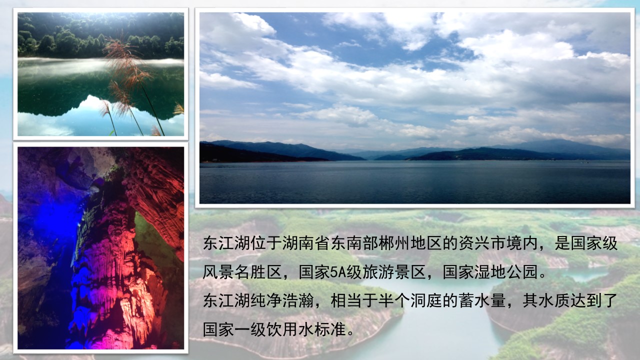 第二天上午大家抵达旅游胜地——“东江湖”。来到东江湖这是未曾预料的美丽,也是上帝赐予的惊喜!遇见前,从未想象; 东江湖远景,离开后,开始想念! 我们来到附近看到一篇湛蓝,去过三亚,到过泸沽湖,这里的阳光没有那么炙热。湖没有那般宁静,可这天山水之间,让人驻足。喜爱悠然而生,于船上看到激荡江水,平静湖面泛起涟漪 近处的远处的山,悉数到来,而近处,我看到满眼的蓝,怀念起当年在蜈支洲岛上,看到那深深浅浅的蓝。透过树叶的那些灵动,如此有趣。什么时候,阳光已经照耀这湖面,这天蓝水蓝的,这明亮安静的,怎不叫人欢喜;在心底里,我们是渴望这样的纯净,而如若没有那阳光,它定不会如此单纯如此动人!稀稀松松的绿装扮着湖边那耸立的石头,平望去是高高的,向下看,于水相接处波光粼粼 !